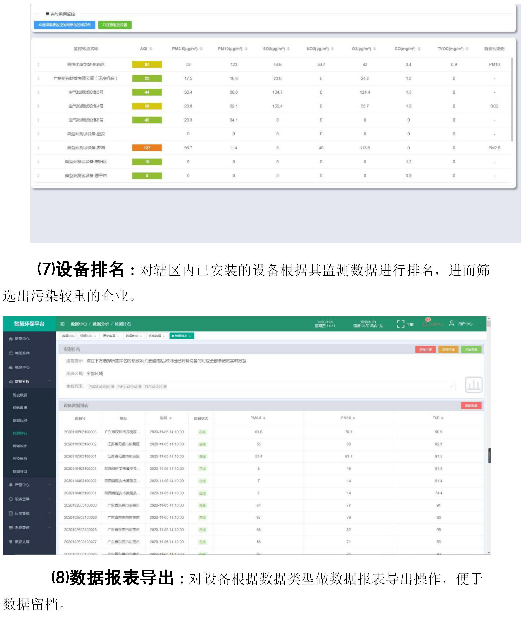 ⑺設(shè)備排名:對轄區(qū)內(nèi)已安裝的設(shè)備根據(jù)其監(jiān)測數(shù)據(jù)進(jìn)行排名,進(jìn)而篩選出污染較重的企業(yè)。
