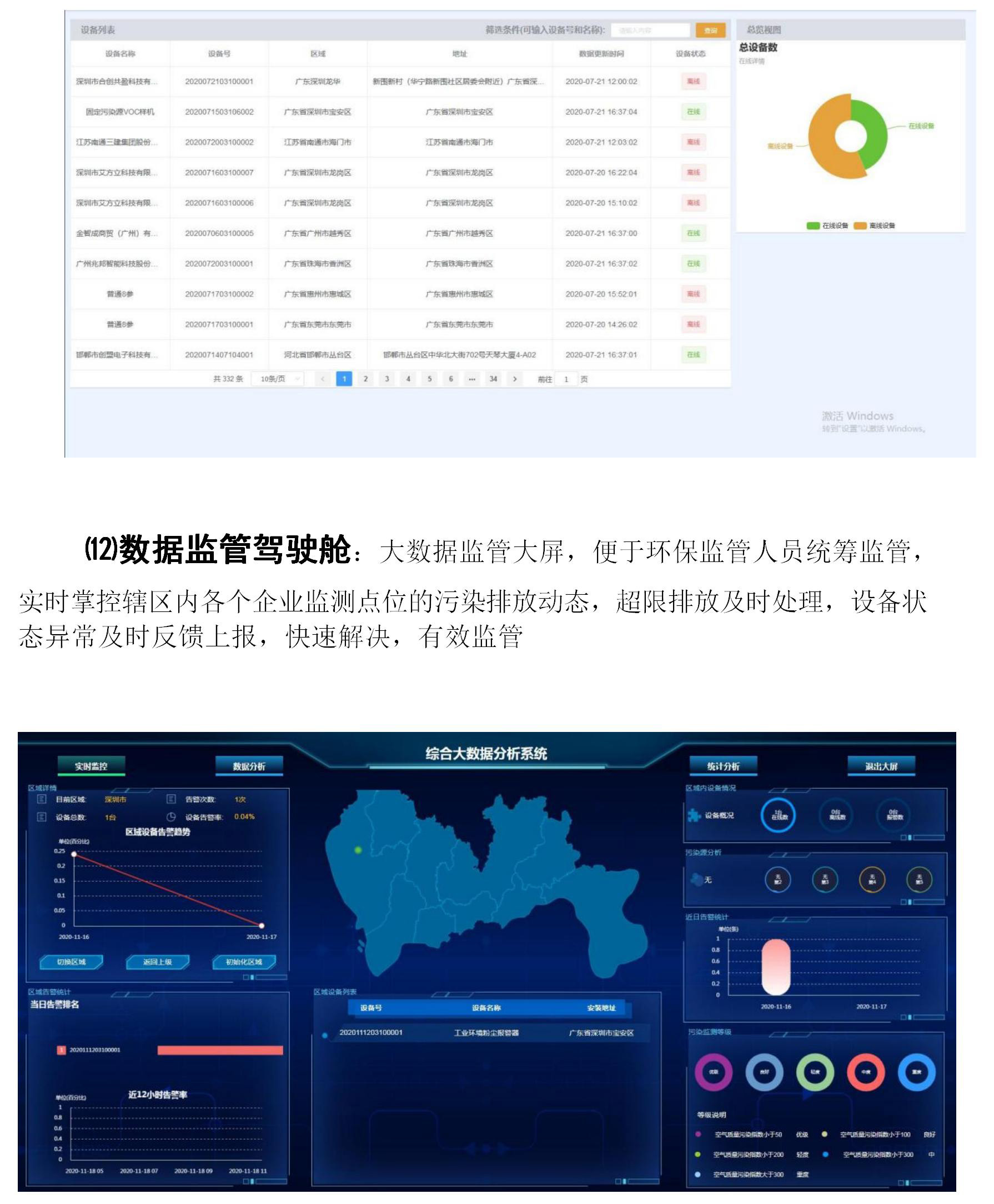 ⑿數(shù)據(jù)監(jiān)管駕駛艙:大數(shù)據(jù)監(jiān)管大屏,便于環(huán)保監(jiān)管人員統(tǒng)籌監(jiān)管,實(shí)時(shí)掌控轄區(qū)內(nèi)各個(gè)企業(yè)監(jiān)測點(diǎn)位的污染排放動(dòng)態(tài),超限排放及時(shí)處理,設(shè)備狀態(tài)異常及時(shí)反饋上報(bào),快速解決,有效監(jiān)管